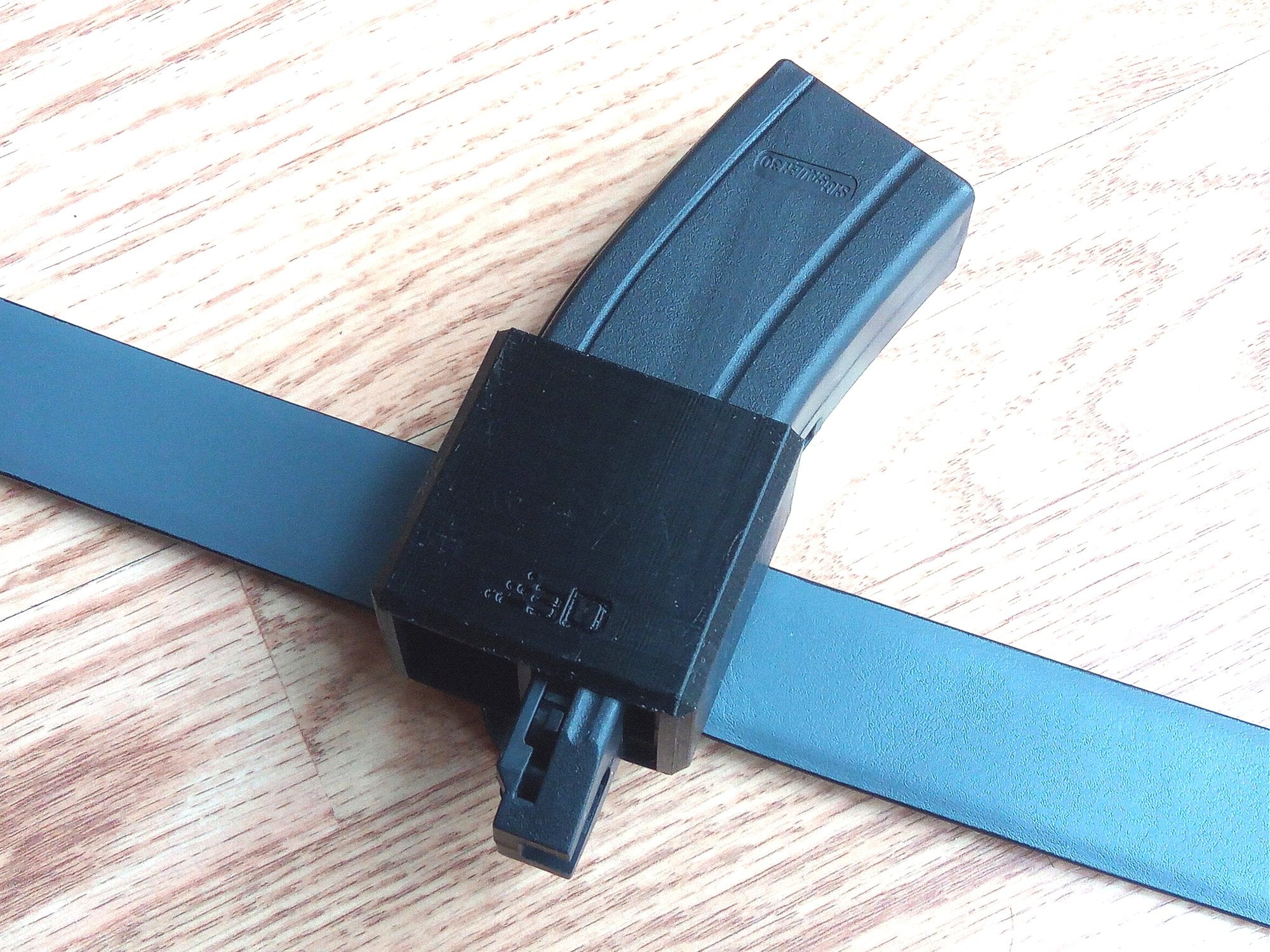 This magazine carrier pouch holds the MCX/MPX airgun magazine on dress belt. It has a belt clip that and fit a belt that is 35mm wide and 3.5mm thick. This mag carrier allows you to carry the magazine in four different orientations: