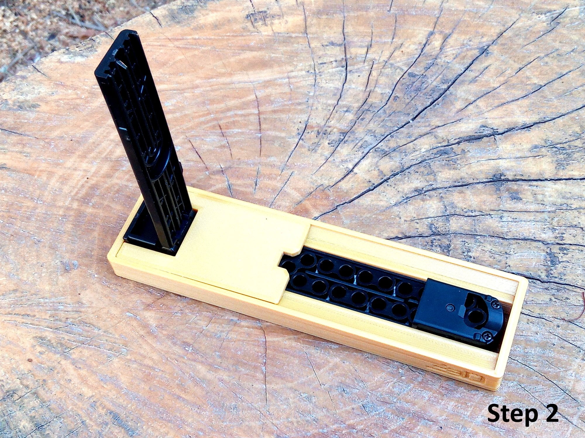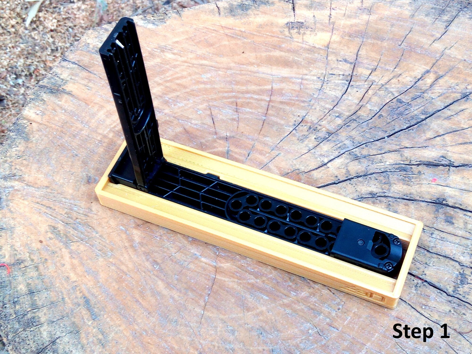 4) Shake the tool, on the flat surface, until the heads of the pellets are in the belt holes.