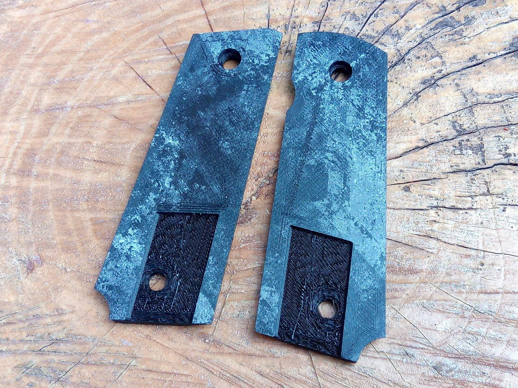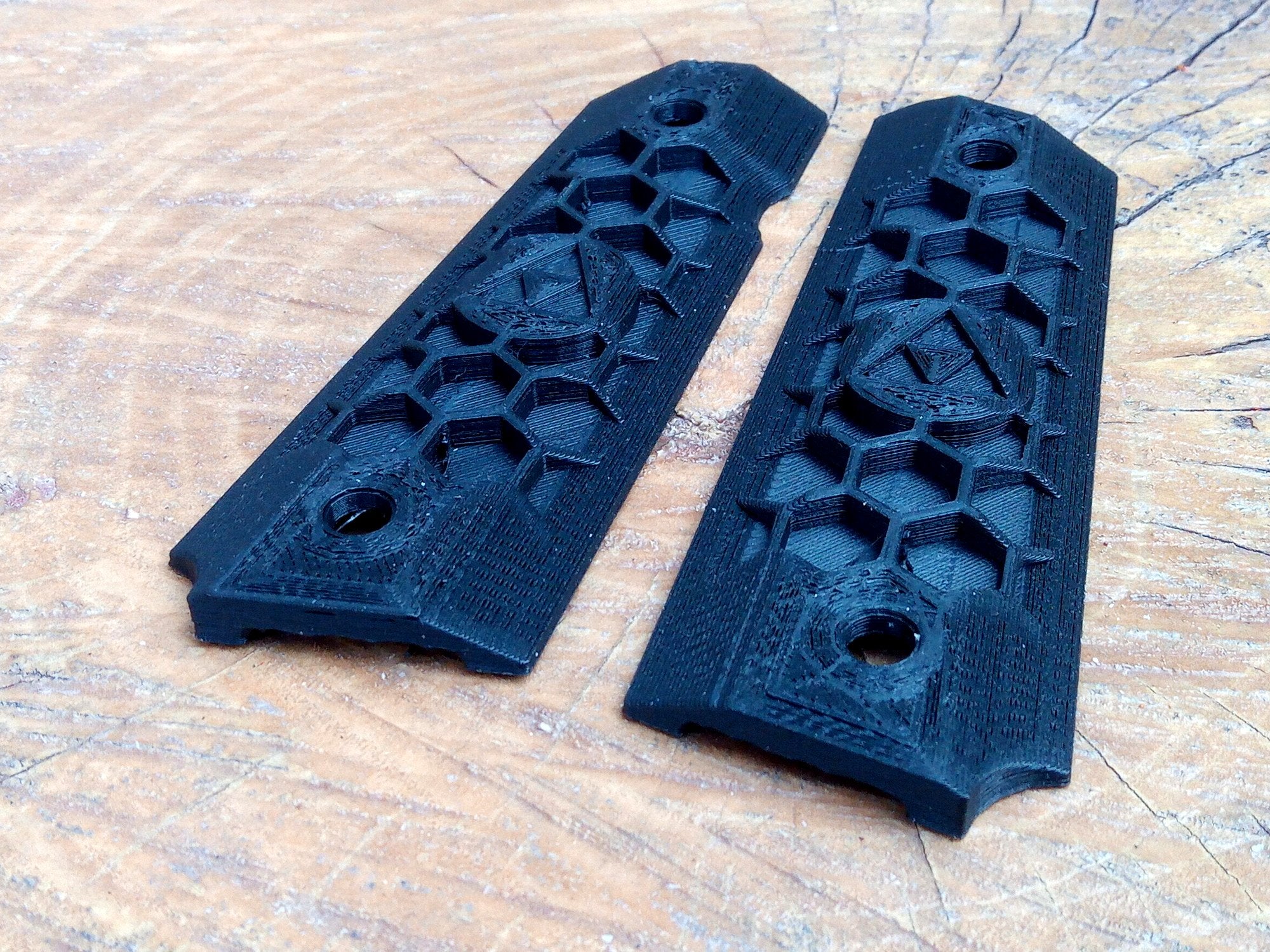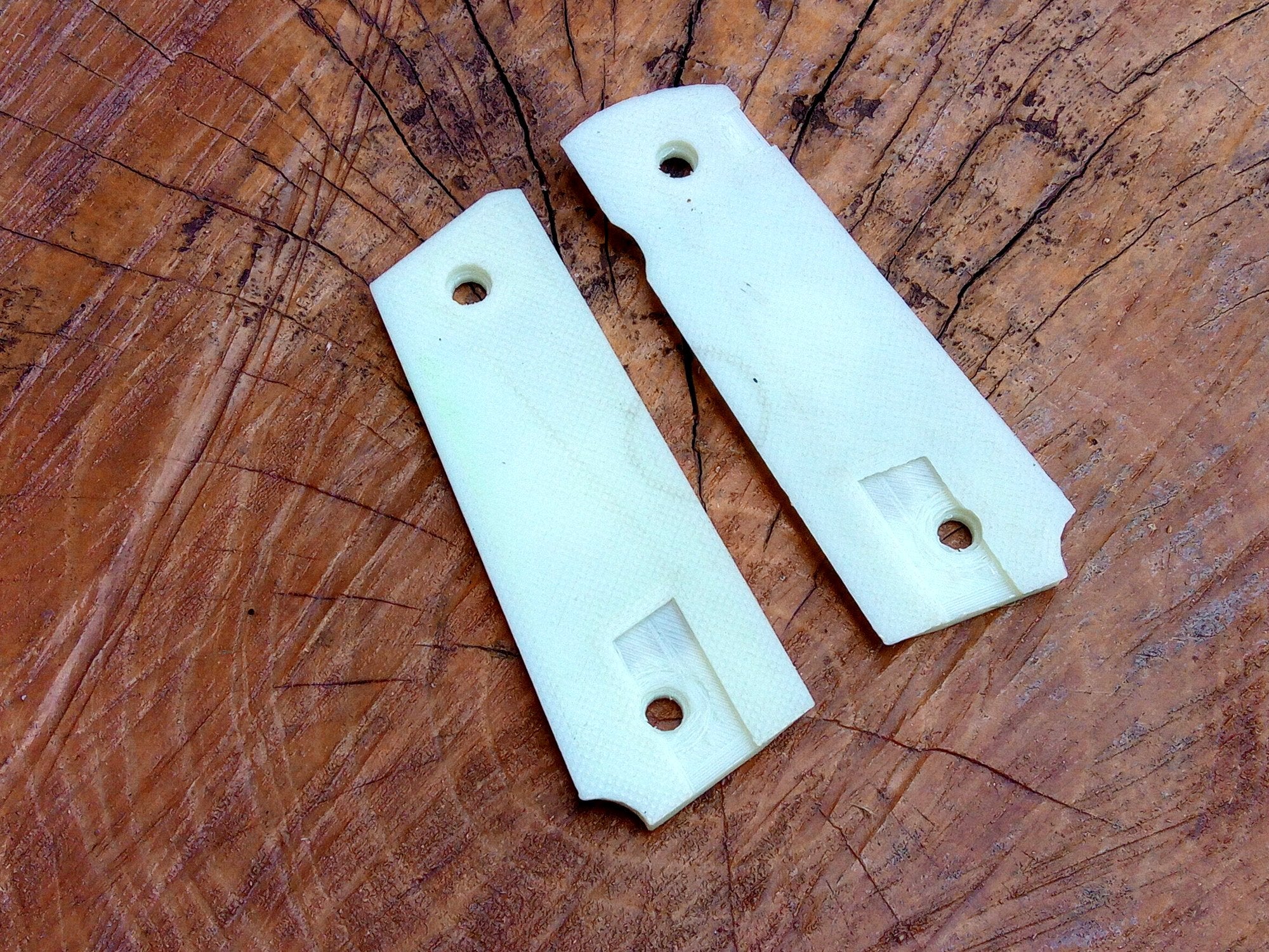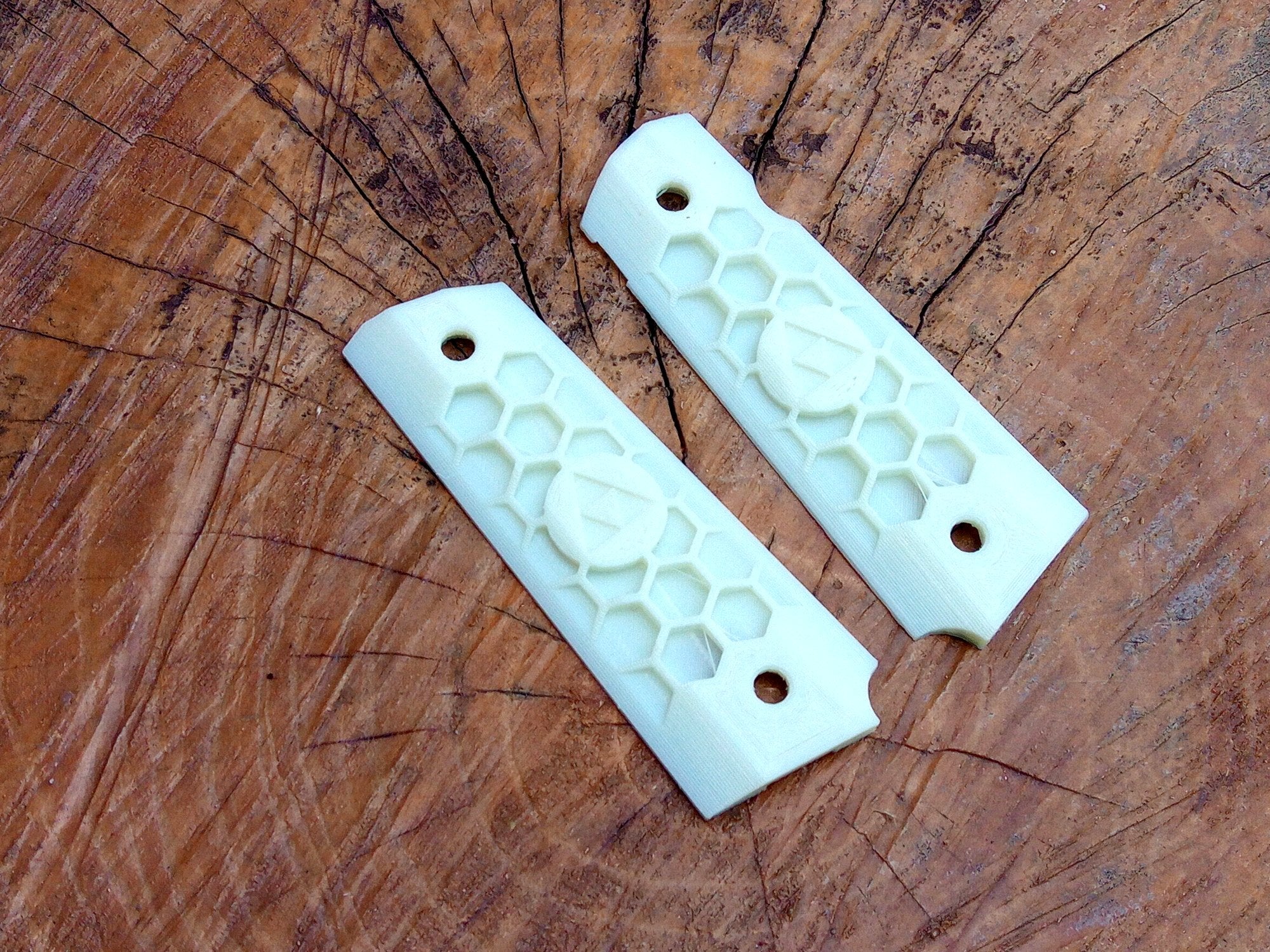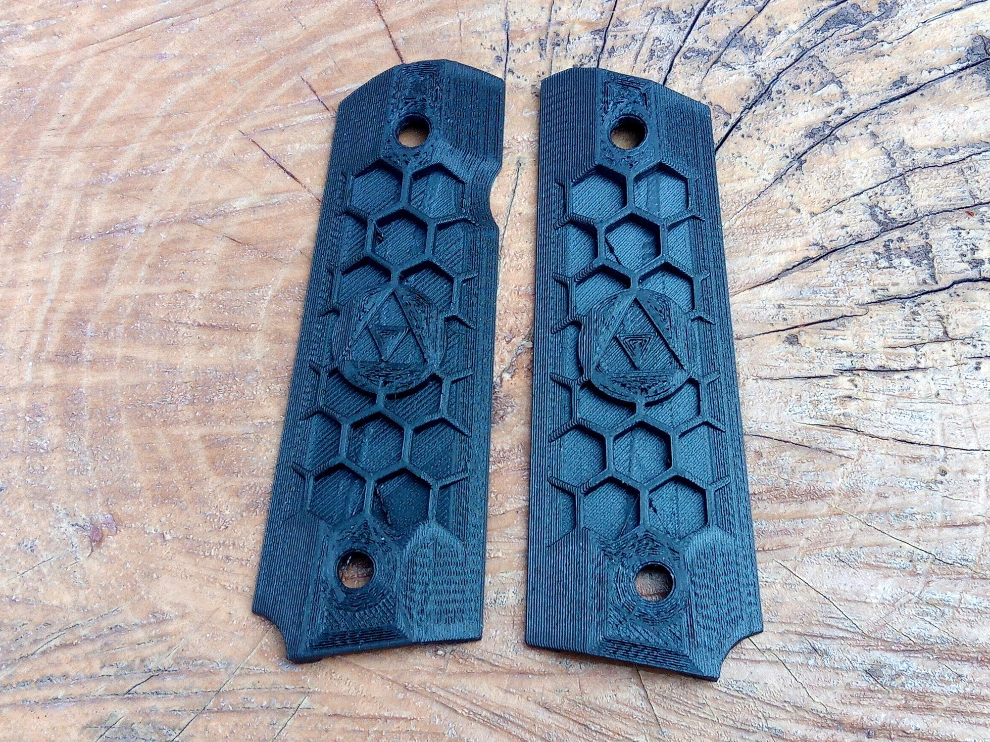 A set of pistol grips for 1911 airsoft pistols. Tested compatibility with KJW, KWC, and WE 1911 airsoft pistols.