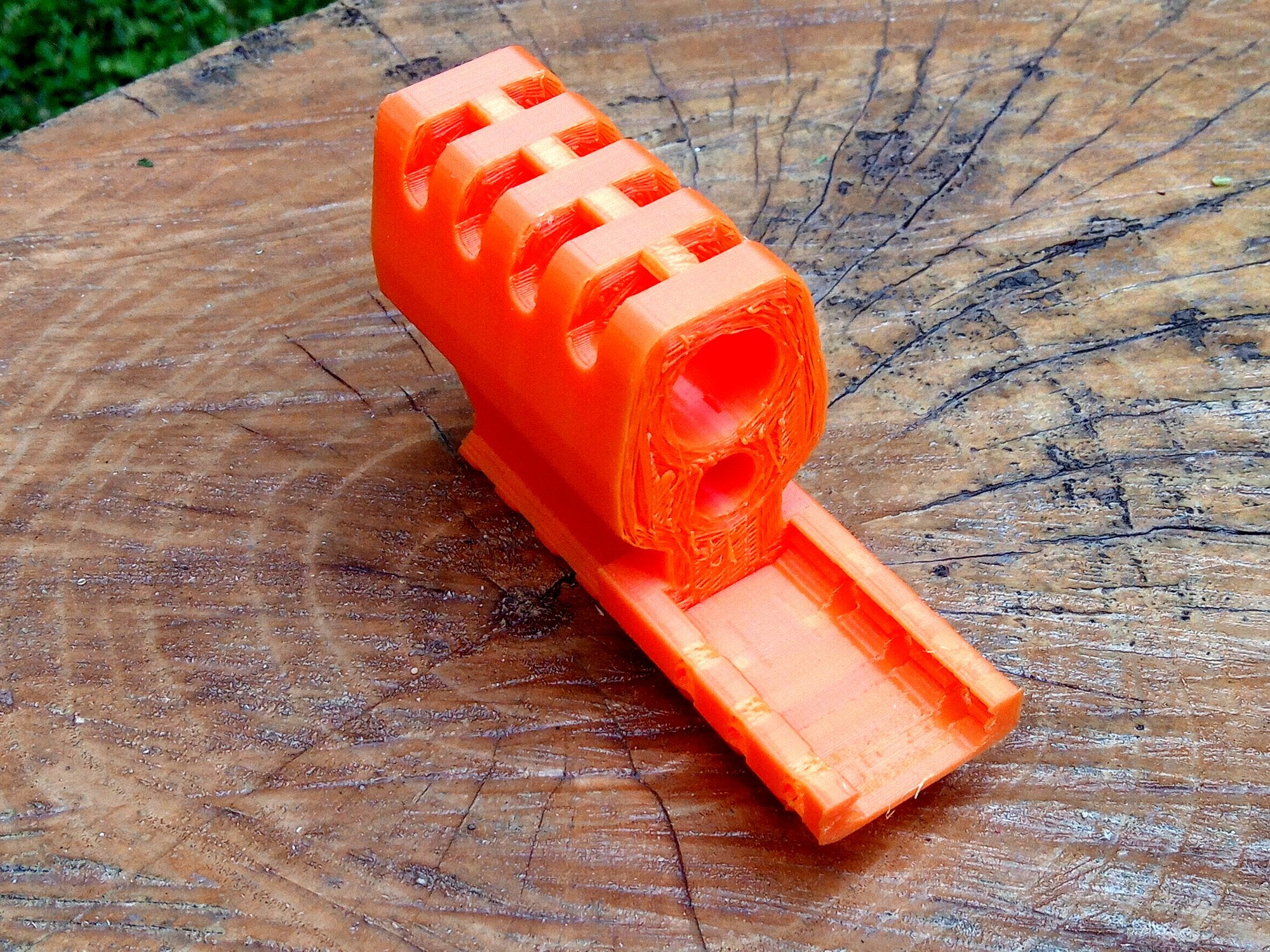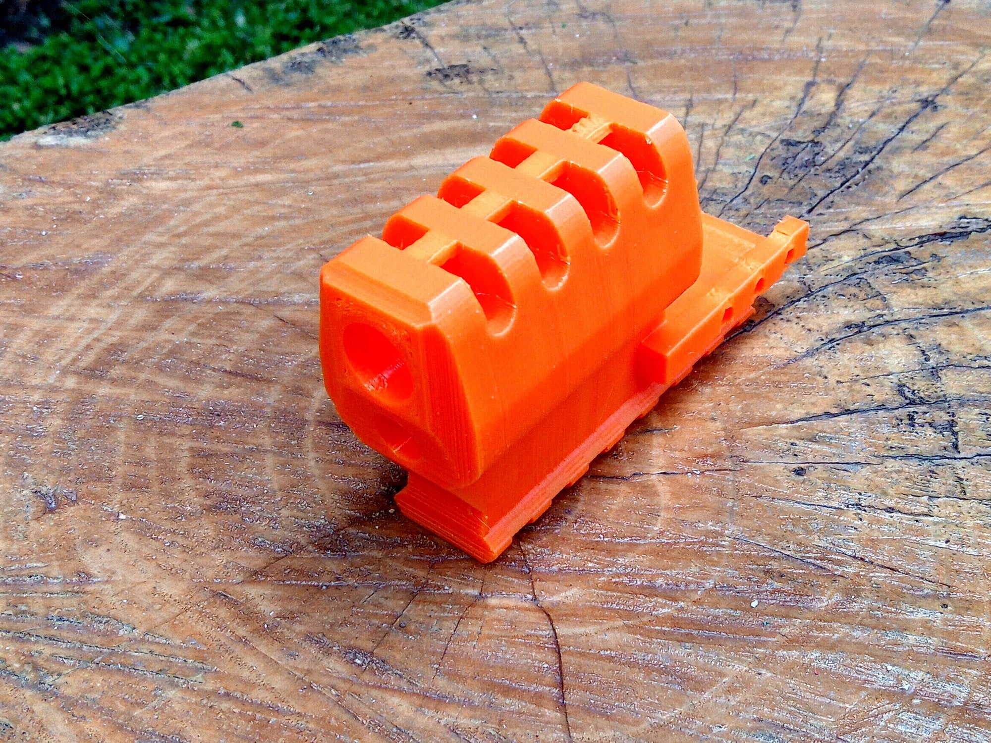Airsoft barrel tip, flash hider, flash suppressor, mock silencer, muzzle brake, muzzle device, and barrel extender. Excellent for hiding a longer inner barrel.