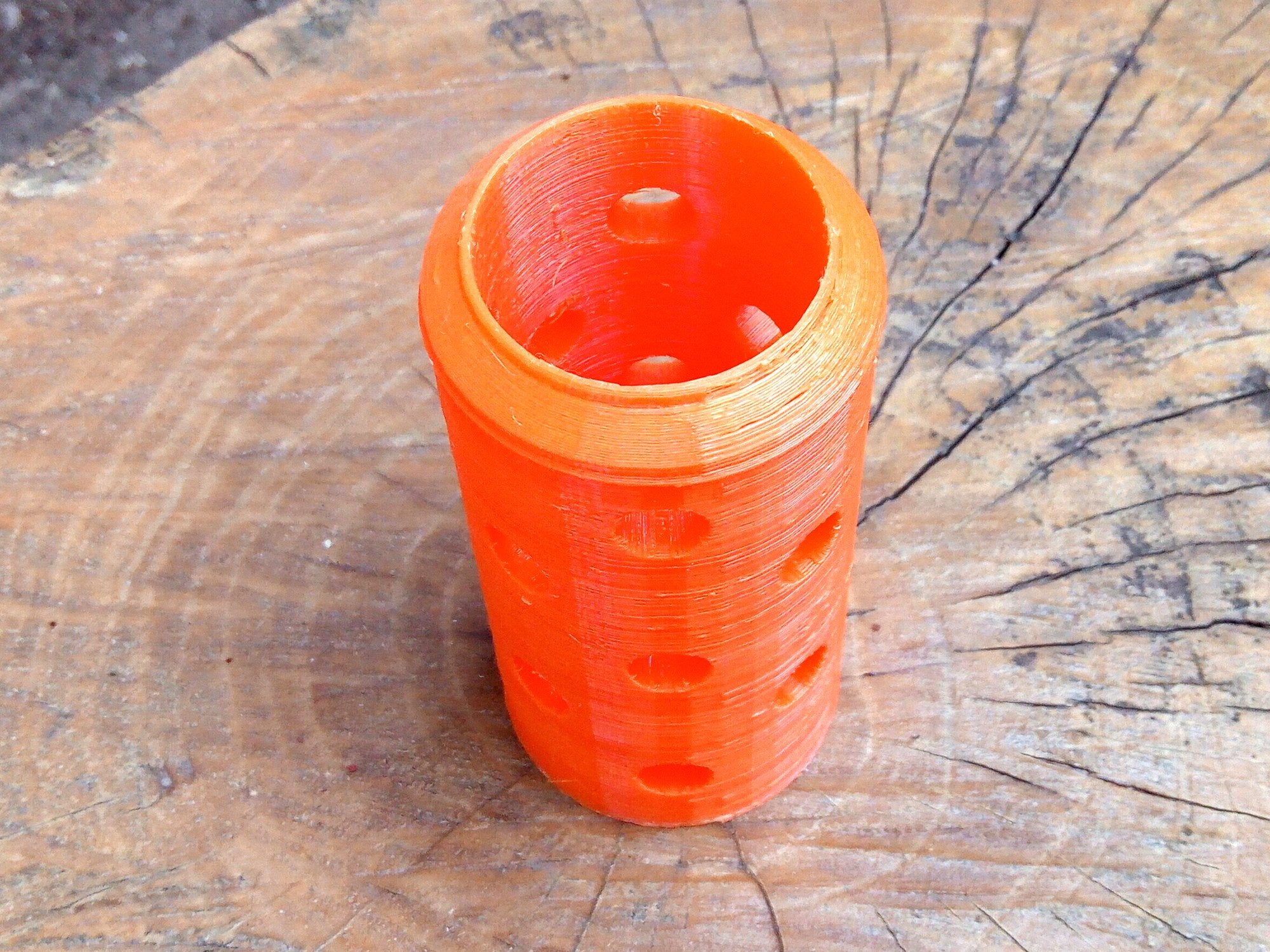 Foam dart toy blaster barrel tip, flash hider, flash suppressor, mock silencer, muzzle brake, muzzle device, and barrel extender. Excellent for hiding a longer brass inner barrel.